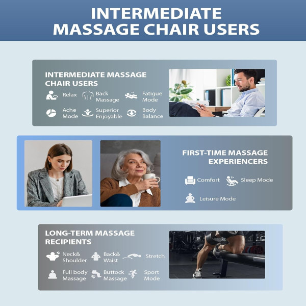 Full-Body Relaxation with 42 Airbags: This massage chair full body is equipped with 42 airbags that provide comprehensive coverage from shoulders to feet, combined with lumbar and leg heating for added comfort. Perfect for those who are sedentary, experience muscle fatigue, or need stress relief, this electric recliner ensures a deeply soothing massage experience.